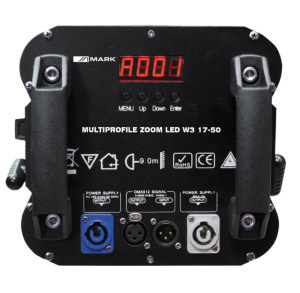 The MULTIPROFILE ZOOM LED W3 17-50 is a lighting projector that includes a 200W white COB LED. This powerful LED produces a homogeneous white tone with a color temperature of 3200K. The configuration interface features a screen with all the necessary information and buttons for navigating the menus, selecting parameters such as two different strobe effects, audio modes, and manual level control. Its manual blades, zoom, and focus allow for precise control of the desired effect on stage. Additionally, the device includes handles on the back for directing the beam. It also features DMX mode (1, 2, or 3 channels) with dimming and strobe functions.