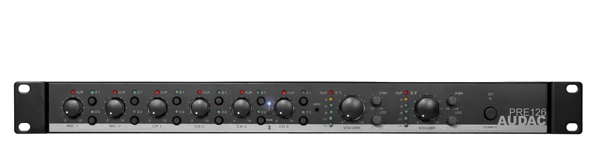 The PRE126 is two-zone 6 channel stereo preamplifier containing a variety of input possibilities for microphone and line level audio signals, offering a possibility for a wide range of small to medium sized audio installations in various kinds of applications with a two-zone audio distribution system. It features two balanced mono inputs with phantom power and three band tone control allowing connection of microphones or line level signal sources. The switchable talk over function suppresses background music if a priority signal is present, making it suitable for paging or voice file announcements. The four stereo line level inputs are implemented as a balanced one fitted with XLR connectors and three unbalanced ones fitted with RCA connectors. Hereby, connection possibilities for a wide variety of line level sources is guaranteed. Additionally, an integrated Bluetooth receiver (mixed with Ch 3) and 3.5 mm jack connection on its front panel (mixed with Ch 4) are offering convenient wired or wireless connection possibilities for portable and handheld devices including laptops, smartphones and tablets. A priority mute contact suppresses all (nonpriority) music sources in case of contact closure, allowing to link autonomous alarm systems. Input volume control is done using the corresponding rotary dials on the front panel, while routing is settings are made through zone selection buttons. Each output section features a 6-segment LED VU bar, a master volume control and 2-band tone control. Connections and input or output configurations such as gain adjustment and mono/stereo switching can be done through the provided controls on the back of the device.